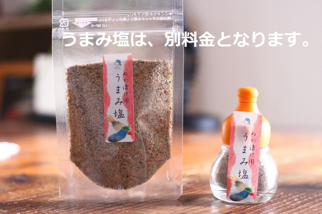 想ふ種の足し糠もセットですので、ぬか床が減って来たときのほか、ぬか漬けを続けていると酸味が強くなったり、発酵が強すぎたり、塩っ気を足したいときなどにお使いください。