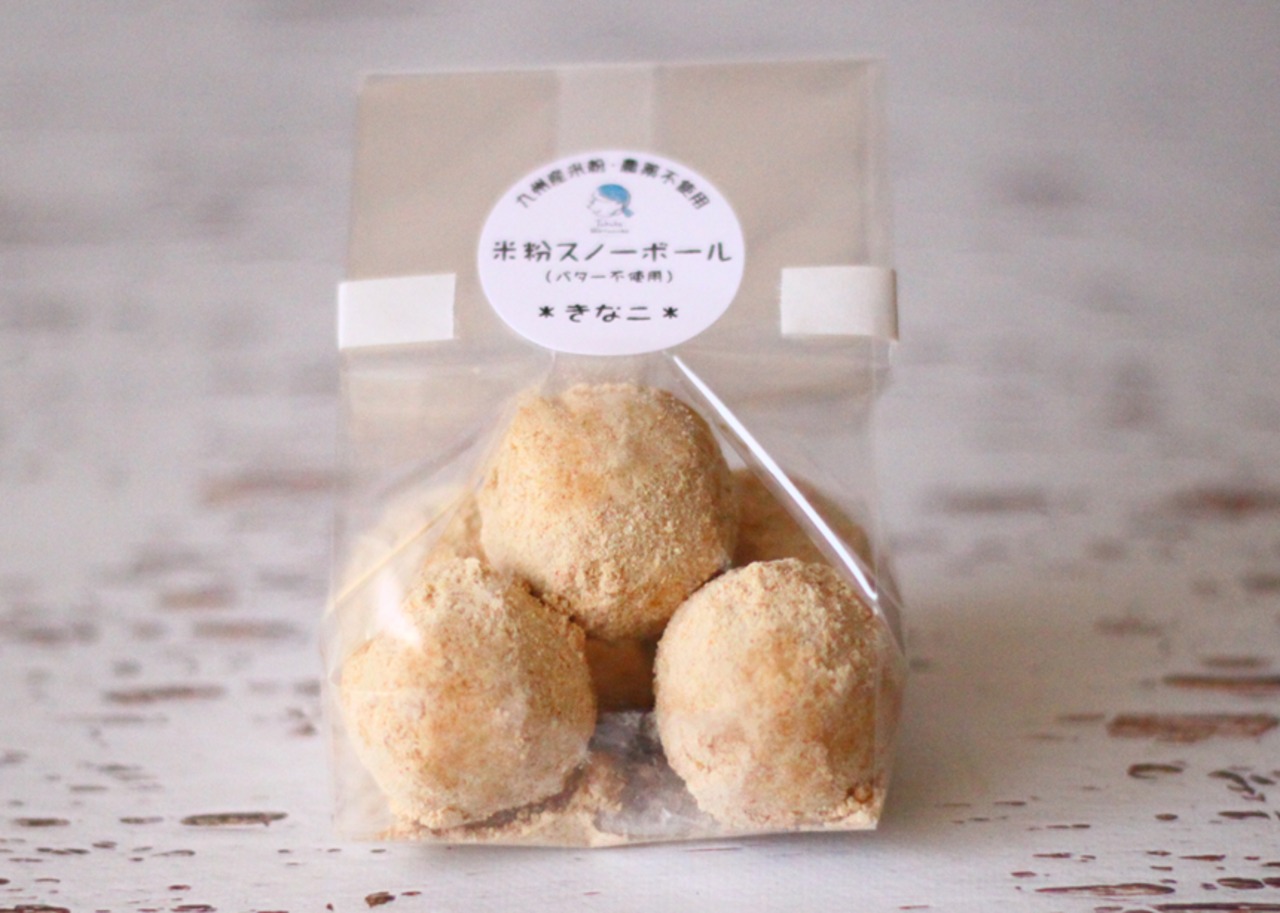 バターや卵を使わず、九州産の農薬・化学肥料不使用の米粉と、安心な非遺伝子組換えの菜種油で作られた、グルテンフリーの米粉スノーボールクッキーです。
